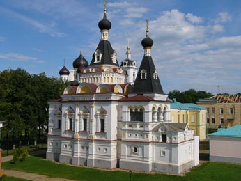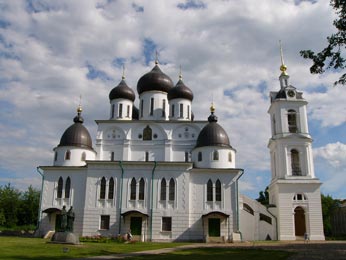 Далее аллея выводит к Успенскому собору (XVI век) - древнейшее здание в городе. Двухэтажный Успенский собор сооружен на средства князя Юрия Ивановича в 1510-х годах. Рядом с собором стоит памятник Кириллу и Мефодию.