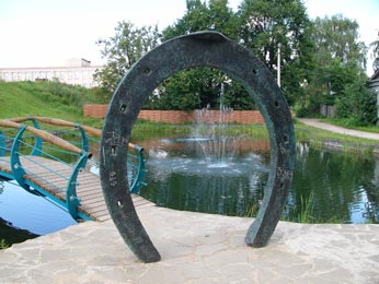 Рядом с деревянными воротами разбит небольшой пруд с фонтаном. Через пруд перекинут мостик, на входе и выходе стоят огромные подковы - под ними по местной традиции проходят молодожены, желающие приобрести "веру, надежду и любовь" согласно гравировке.